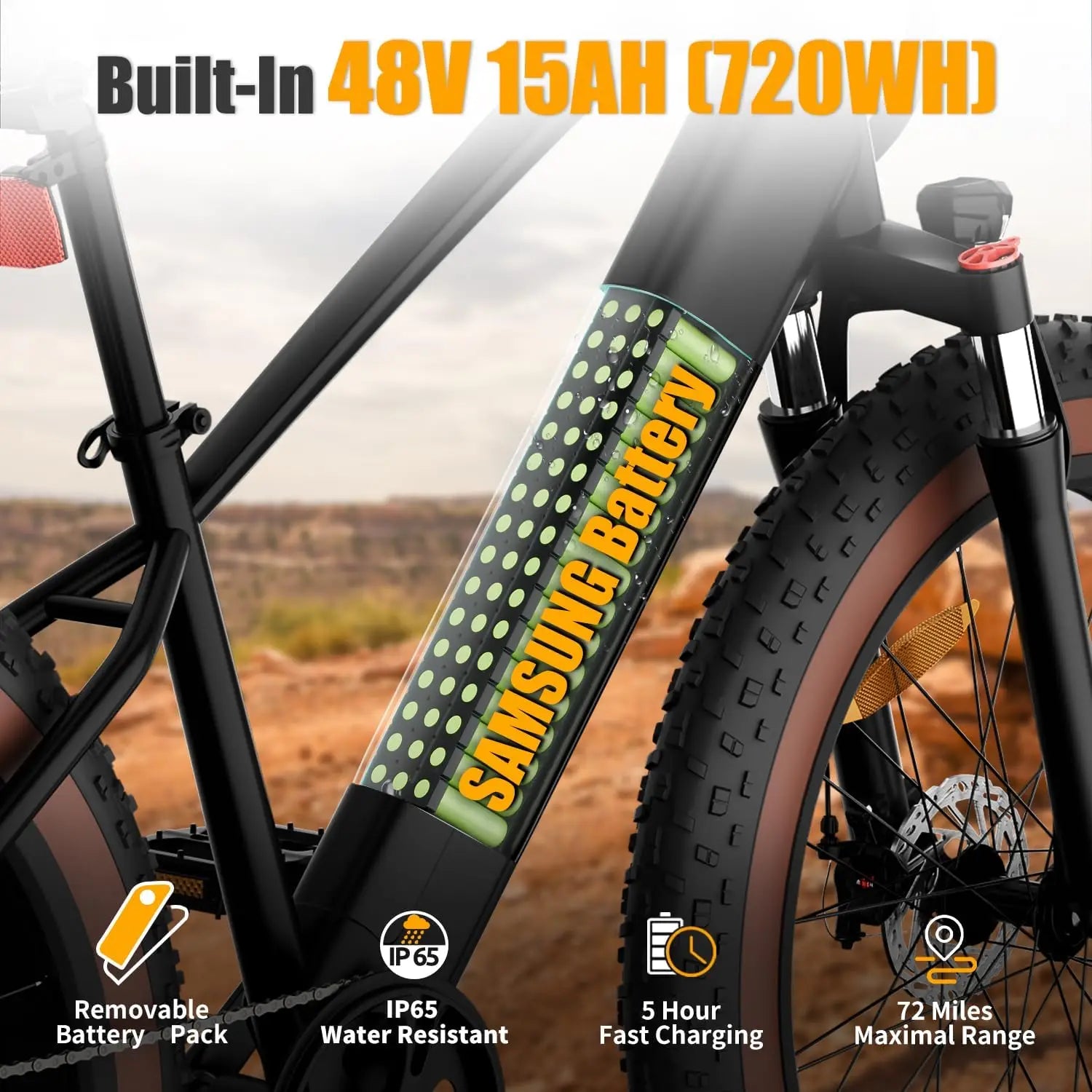 ๐ฒใ72-MILES Longer-Distance Travel - 48V/15AH (720WH) Batteryใ: The Luckeep C26 electric mountain bike for adults can travel up to 72 miles in assist mode thanks to a UL 2849 certified built-in 15AH removable battery. With over 1,500 times rigorous tests, our battery is specially designed for a higher cycle count and has a longer lifespan than ordinary batteries. It has passed the UL certification and IP65 waterproof test.